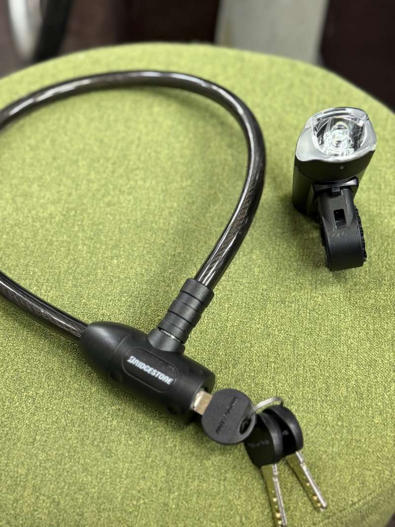 ワイヤー錠、ライト、スタンドなど乗り出しに必要なパーツは全て含まれているので、とりあえず他に買い足すことなく乗り出しできます。※必要最低限なレベルの鍵、ライトですので盗難が心配、夜の安全性が心配なお客様には別途お勧めのモノをご提案致します。