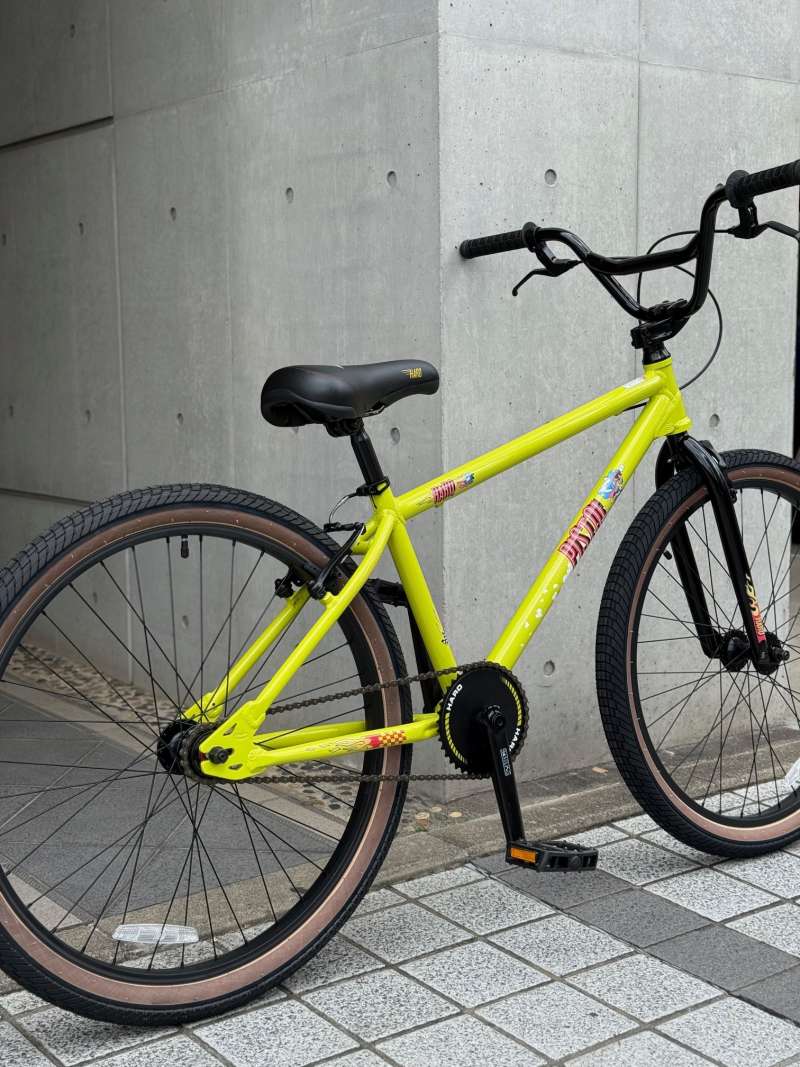 26インチのBMXクルーザーです。タイヤが太いので27インチの走行性を持っています!ペダルの漕ぎ出しは軽く、走り出すとすーーっと進んでゆくくフィーリングはBMXクルーザーならではでは。本当に街中をクルージングしやすいです!写真より実物はもっとカッコイイのでぜひ見にいらしてください!
