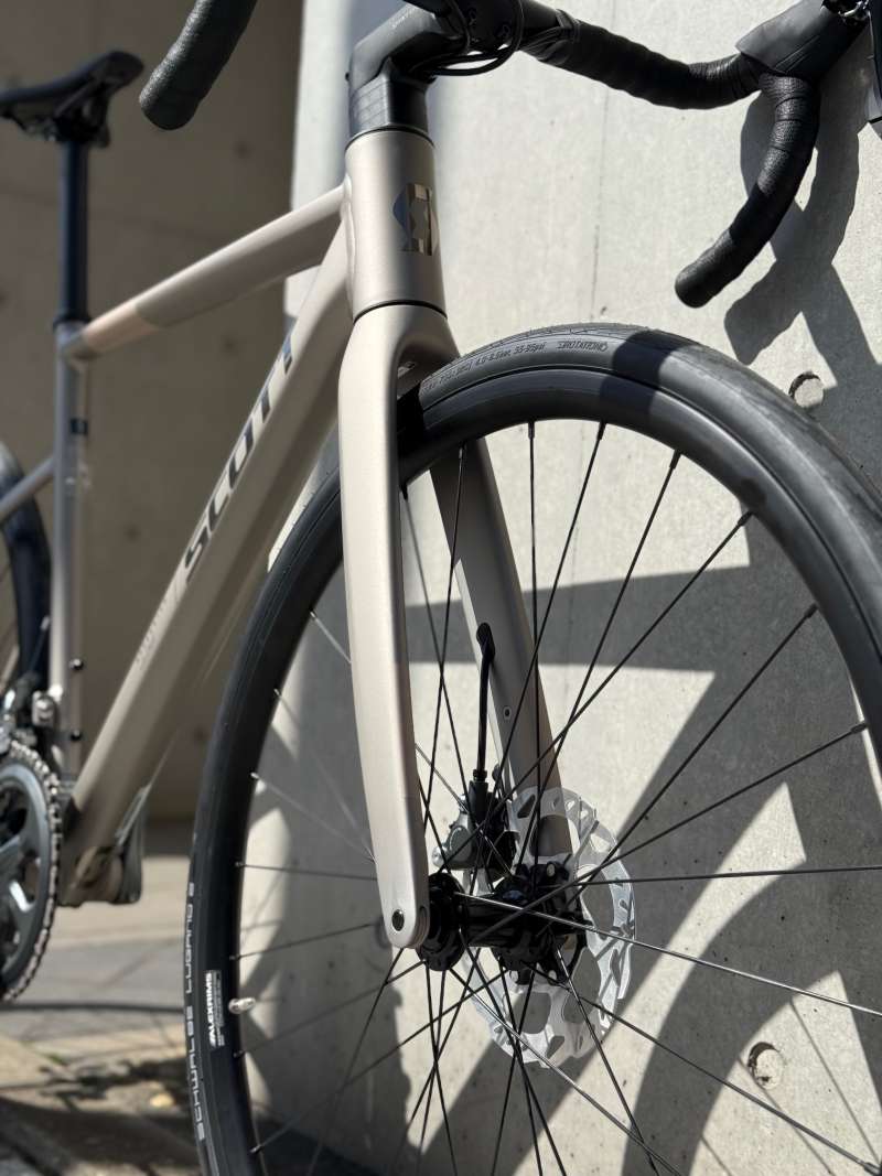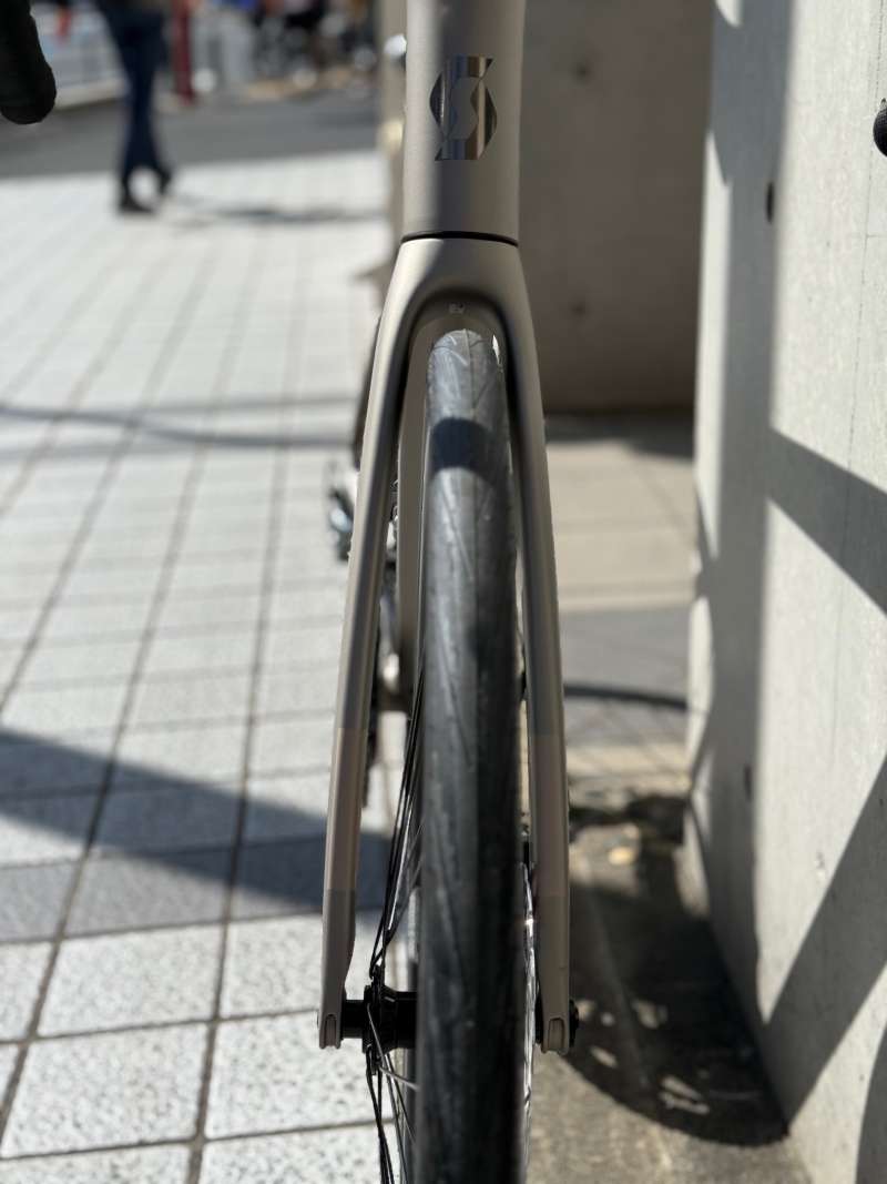 ヘッドチューブからフロントフォークへの美しさも見とれてしまいます。ラインナップ的にはエントリーグレードですが、いえいえこの高級感はエントリーモデルではございません!しなやかに膨らんだフロントフォークのおかげと思いますが乗り心地がとってもシルキーでございます。