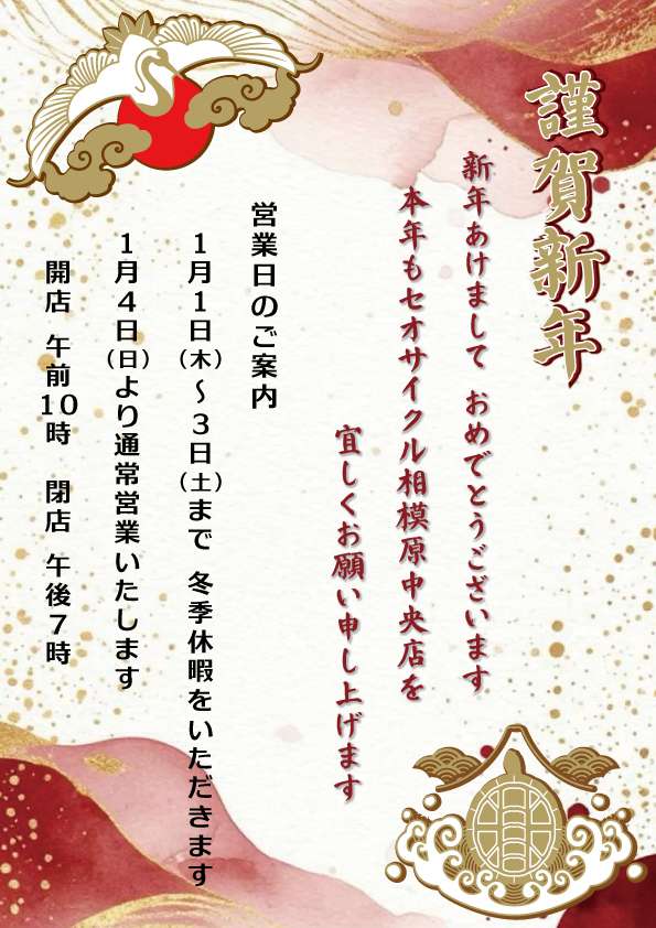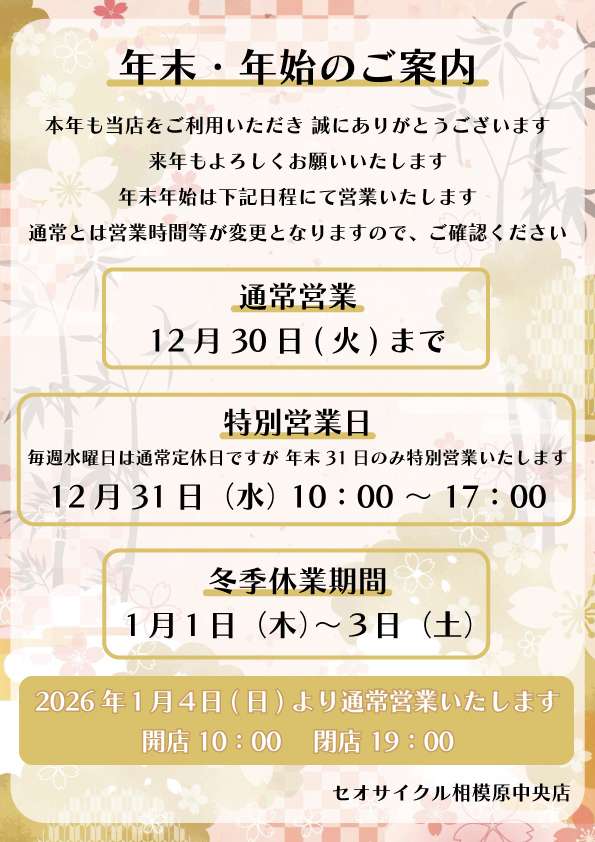 セオサイクル相模原中央店では、12月31日(水)10時00分から17時00分まで「臨時営業」いたします。皆様のご来店、心よりお待ちしております。