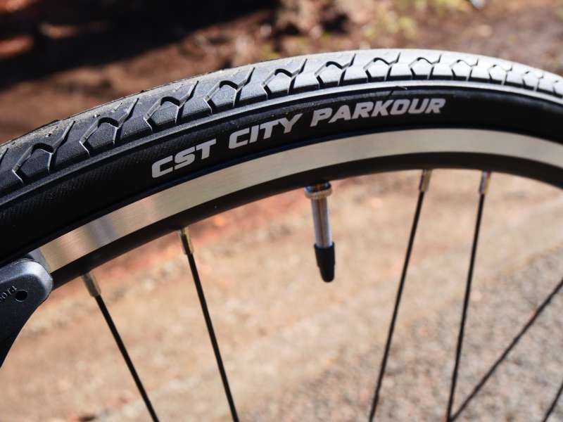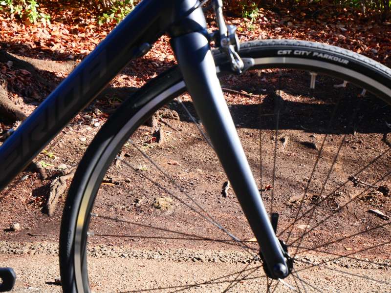 タイヤサイズは700×25Cと、ロードバイクの中ではオーソドックスなサイズを採用しています。バルブ形状はフレンチバルブ(仏式バルブ)のため、スポーツバイク用の空気入れが必要になりますが、高い空気圧に設定できることで、走行感の軽さにつながります。