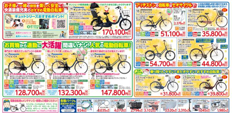 自転車屋一筋30年の店長が、お勧めしたい自転車を厳選してお店に仕入れております。電動自転車、お子様乗せ自転車、ママチャリ、キッズ自転車、クロスバイク、ロードバイク、マウンテンバイク、ミニヴェロ数ある自転車の中から、お客様にピッタリの自転車探しをお手伝い致します!