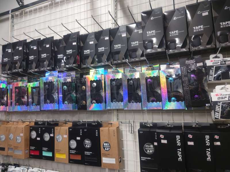 こちらがダメ出しをいただいたバーテープコーナー。バーテープのパッケージはフックにかけられるようになっているので 何も考えずにかけただけの状態です。可もなく不可もなくといった感じでしょうか。