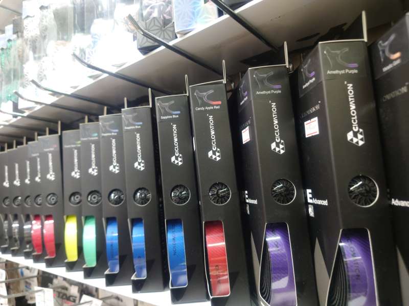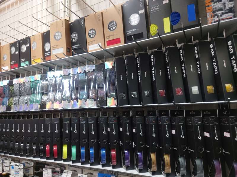 そこでせっかくアドバイスいただいたのでバーテープコーナーをリニューアルしました。今度の展示ではパッケージを斜めにすることでカラーを確認しやすいようになっています。バーテープの本数は変わっていませんが量感も増した感じがします。
