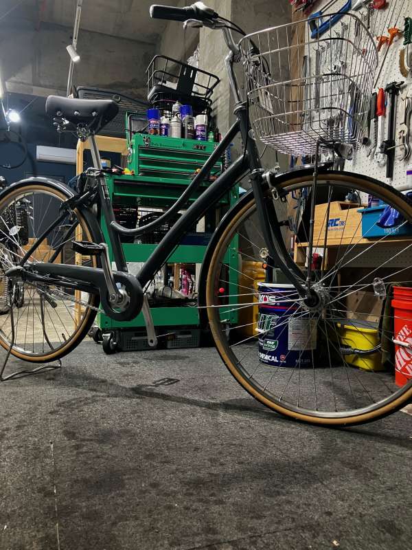 今まではブリヂストンの軽量軽快車の『アルミーユ』の26インチに乗ってらっしゃったとのことで、170cm後半の身長と坂道の多い芝山界隈を考慮して、T型ハンドル(坂道を立ち漕ぎするときに力が入りやすいんです)27インチの車体をおすすめさせていただきました。
