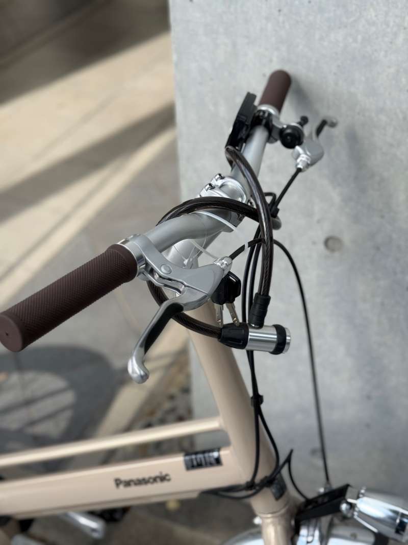 ハンドルもアルミ製で高級感あります。ブラウンのグリップもおしゃれですね!ブレーキレバーには滑り止めのラバーがついています。