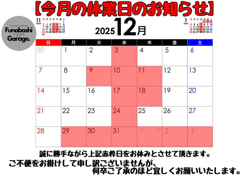 向かい側の船橋ガレージ店と同様のお休みとなります。