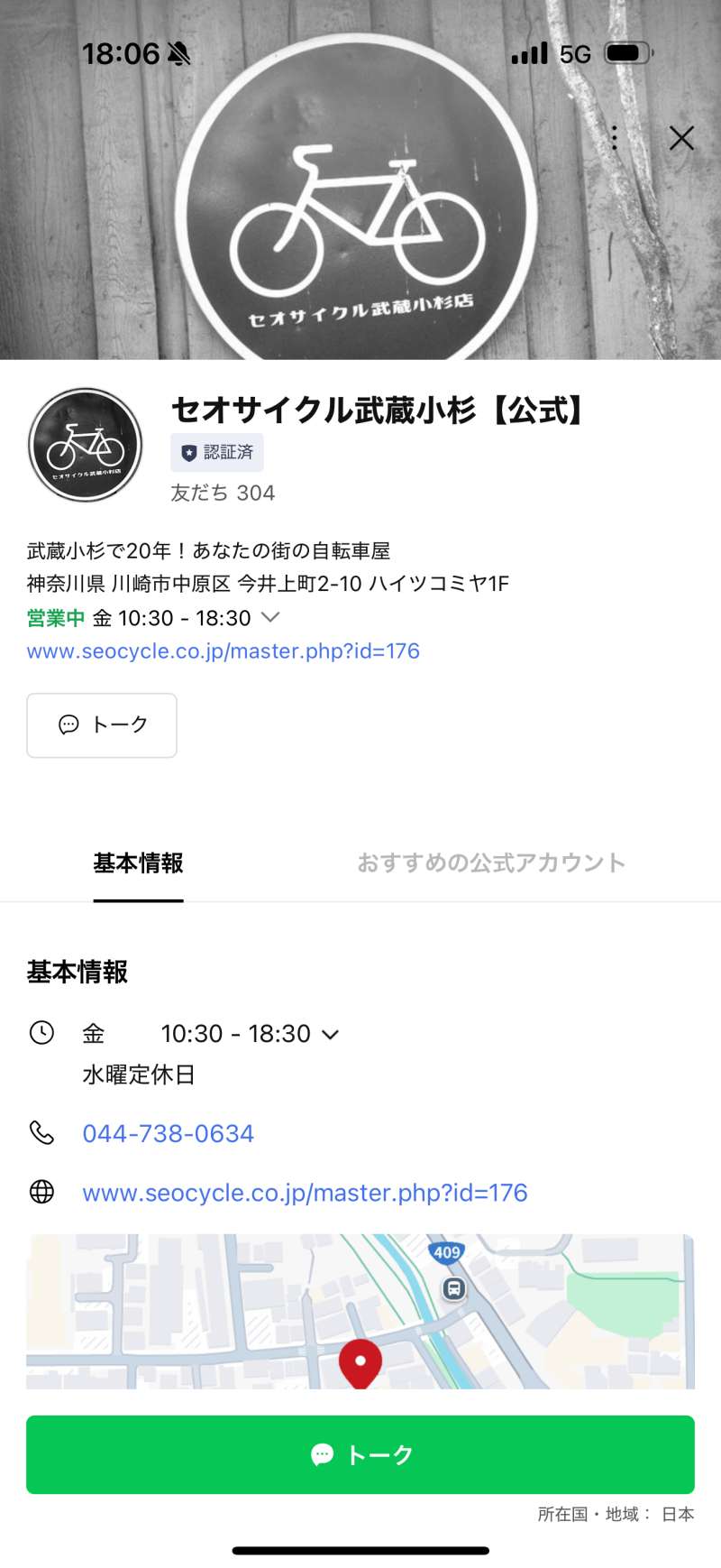 こちらから【セオサイクル武蔵小杉店公式LINE】をご登録いただき