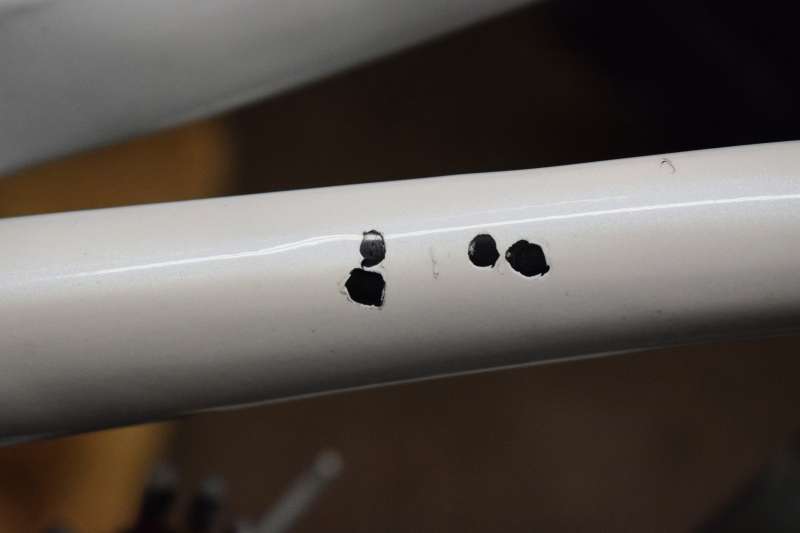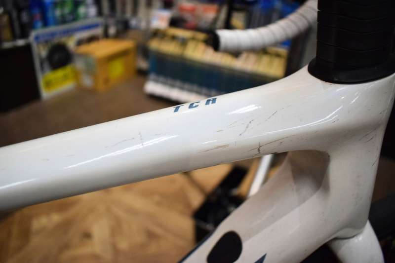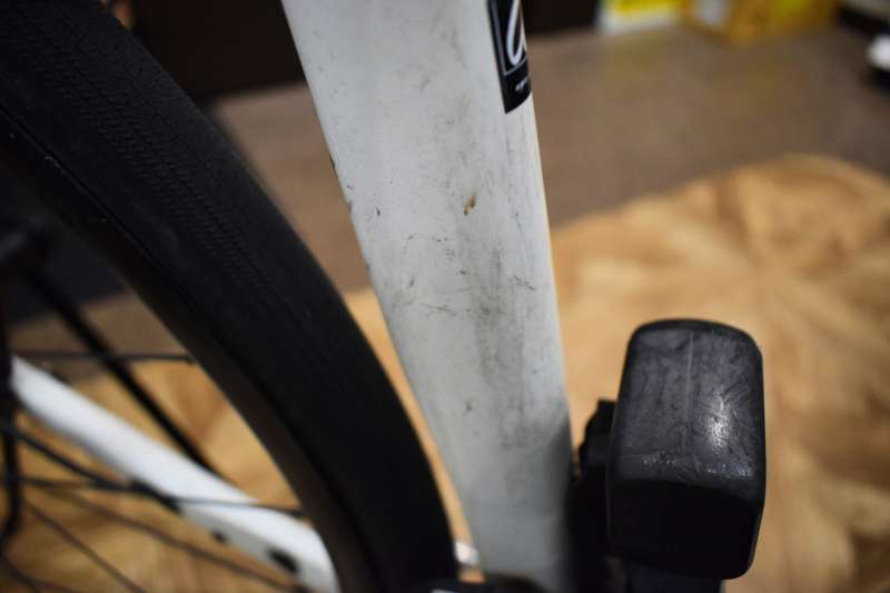 フレームにも無数の小傷が入っています。塗装面に何かを擦ったりするとクリアの表面が荒れてその中に汚れが入り込みます。ホワイトは特に目立ちますね。