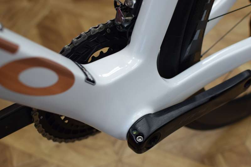 シートステー部もより低い位置に変更、さらにフロントフォークと同じく外側にアールを描いてせり出す形状になっています。回転するホイールとの隙間を大きくすることで空気の乱れ「乱流」を軽減できるそうです。相乗効果でタイヤ幅も太いものが使用できます。