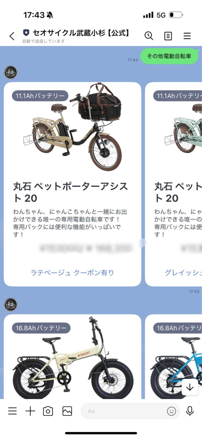 在庫のご確認やサイズのご確認、ご用途に合っているかのご相談もそのまま公式LINEでお問い合わせいただけます!『電動自転車選び方』とご記入いただきますと入力フォームが出て参りますのでご記入の上ご送信ください。※ご年齢を選択いただく欄がございますが、安全性を考慮しての設問でございます。ご心配のいらないお客様は未記入でも構いません!