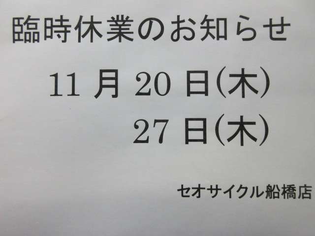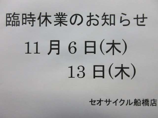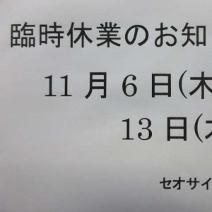 誠に勝手ながら11月6日13日20日27日(木)を臨時休業とさせていただきます。