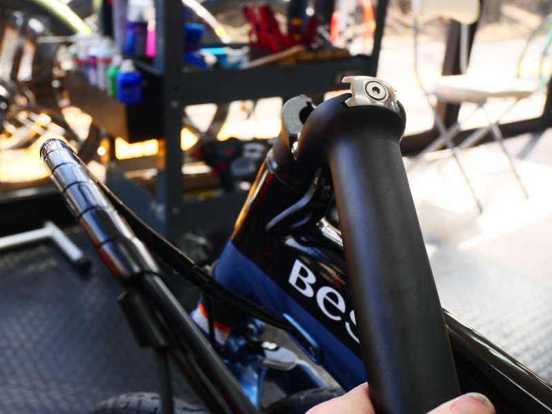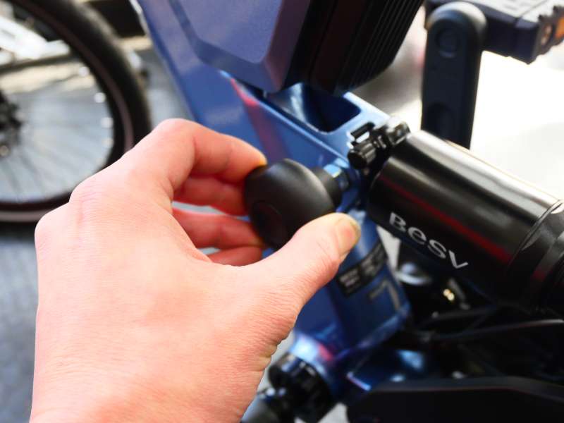 6. フロントフォークを折りたたんだ後、ハンドルを折りたたみます。ハンドルポストの根元付近にレバーがあるので、黒いボタンを押しながらレバーを引きます。
