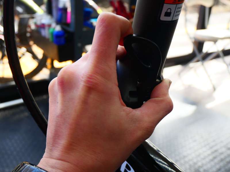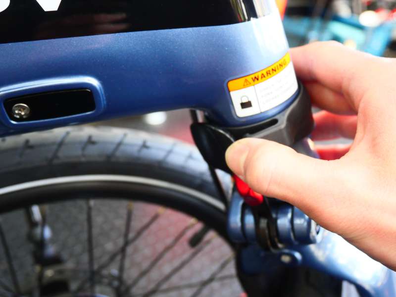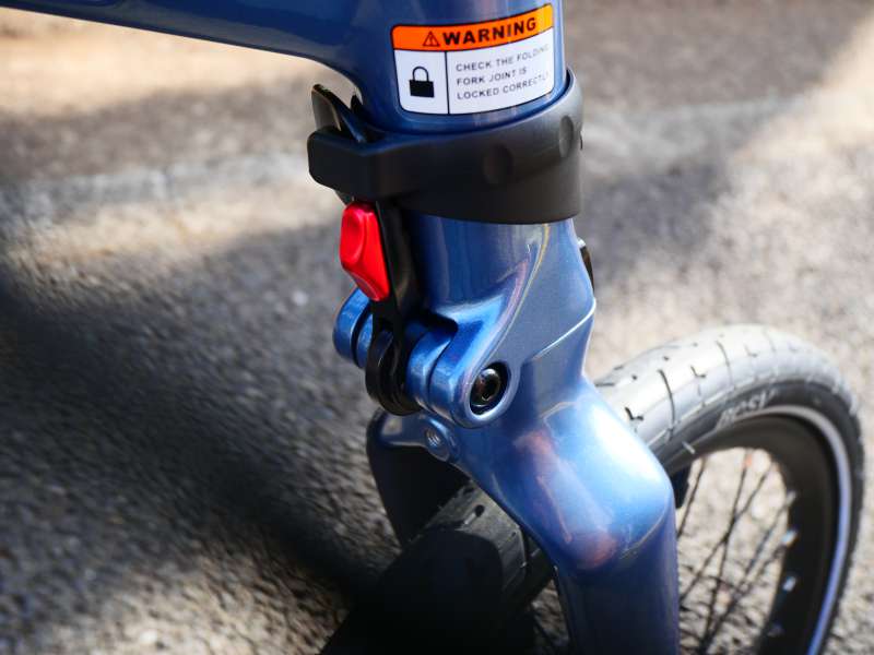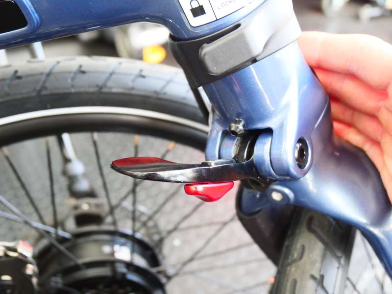 5. 続いて前側を折りたたみます。フロントフォークにあるストッパーを解除し、赤いボタンを押しながらレバーを引きます。