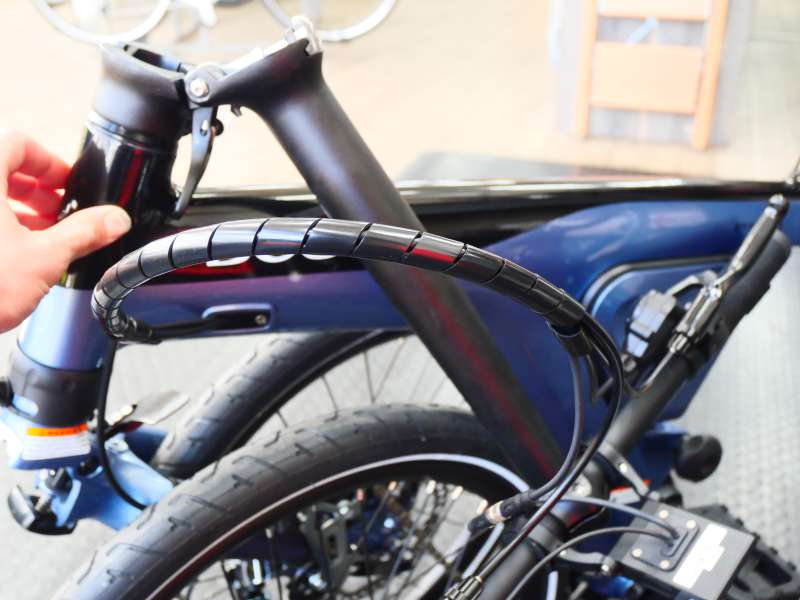 フロントフォークの左横にはネオプレーン製のガードが付いていて、折りたたんだときにどうしても干渉するフロントフォークとフレームの傷を抑えるようになっています。