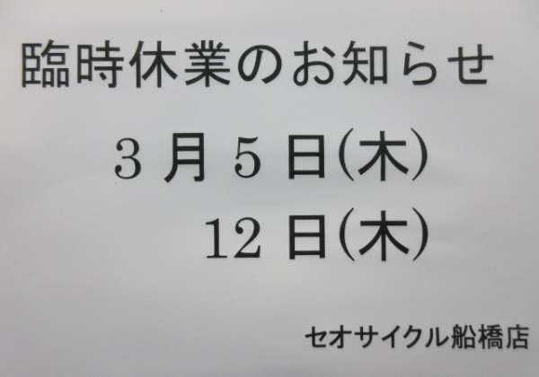 こんにちは、セオサイクル船橋店です。 日頃格別のお引き立てを賜り厚く御礼申し上げます。 誠に勝手ながら3月5日12日(木)を臨時休業とさせていただきます。