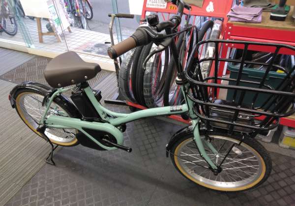 セオサイクル市川店です! パナソニックの小径タイプの電動アシスト自転車「グリッター」の限定カラーが入荷しました! ダスティミントというカラーになります。さわやかなミントグリーンです
