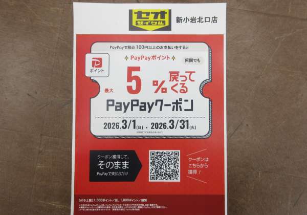 こんにちは セオサイクル新小岩北口店です。 当店でも始まりました! ペイペイで税込み100円以上のお買い物で ペイペイポイント最大5%戻ってくるクーポン配布中! 付与上限:1000ポイント/回、1000ポイント/期間 期間:2026年3月1日~2026年3月31日 ※予算の都合で…