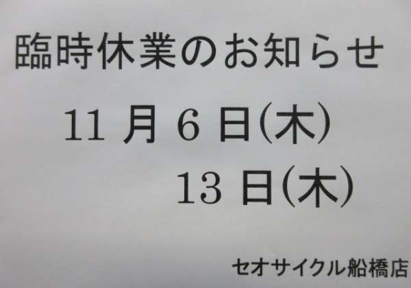 こんにちは。セオサイクル船橋店です。 日頃格別のお引き立てを賜り厚く御礼申し上げます。 誠に勝手ながら11月6日13日20日27日(木)を臨時休業とさせていただきます。 ご不便をおかけいたしますが、ご了承のほど何卒よろしくお願…