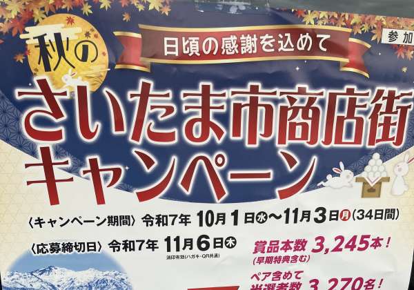 10月1日から-さいたま市商店街活性化キャンペーン事業- ~日頃の感謝を込めて、秋のさいたま市商店街キャンペーン~ 始まります ※10月1日は水曜日のため、当店定休日でございます※ 当店では、500円のお買い物ごとにQRコード付きの応募ハガキを一枚お渡ししており…