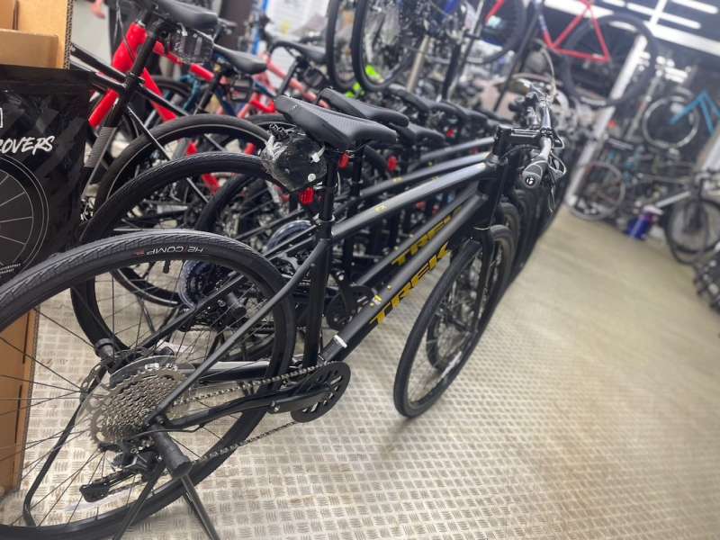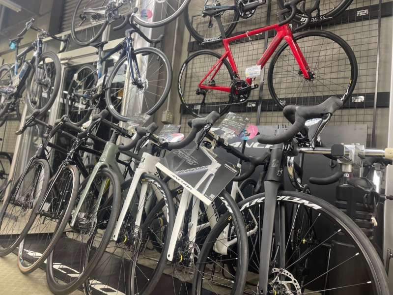 店を正面に右側に3台分駐車可能です!(※一番奥は利用できません。※)クロスバイクにロードバイク、グラベルロードバイクをメインに展示中です。