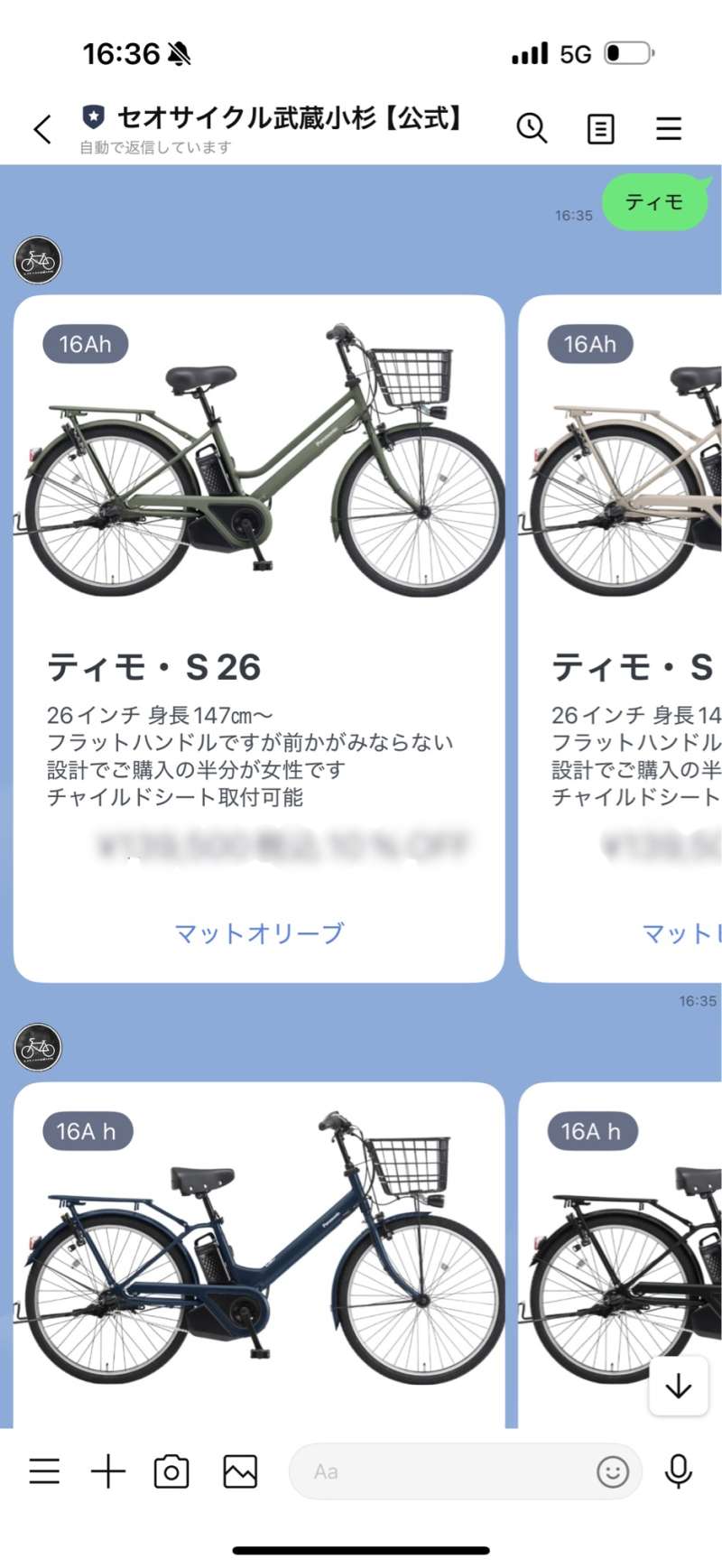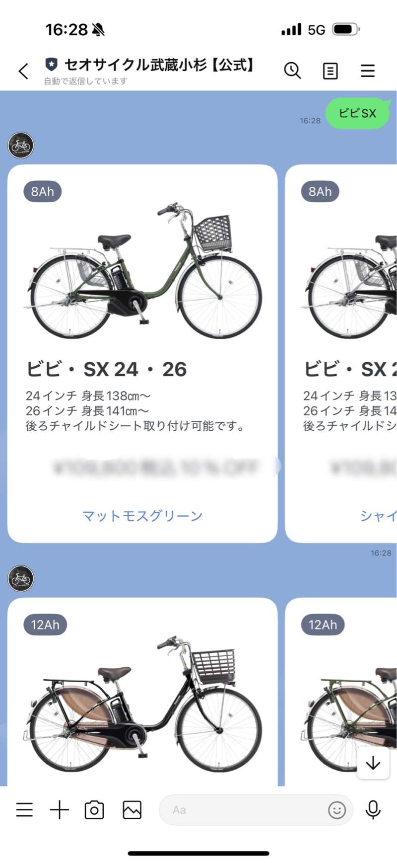 当店の公式LINEからワタクシ店長上野が『自分のカミさんや子供、親兄弟にこれなら安全に乗せられる!』とお勧めしているパナソニック車の電動自転車の販売価格、カラーを見られるように致しました!