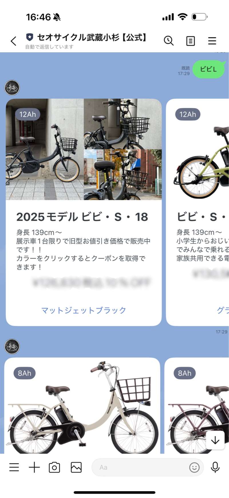 『ビビL』『ビビSL』『ビビSL20』『ビビS18』のいずれかをご記入いただきと、こちらの4アイテムについて、サイズ、カラー、販売価格がお写真付きでご覧いただけます!もちろんお店に在庫があればその場でお持ち帰りいただけます。メーカー様よりお取り寄せの場合は概ね1週間ほどでご用意できます!在庫のご確認やサイズのご確認もそのまま公式LINEでお問い合わせいただけます!