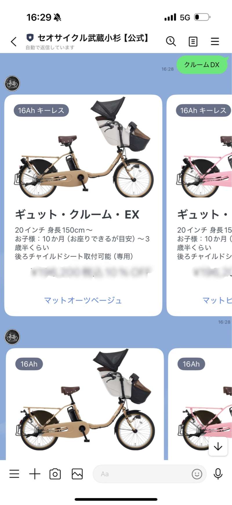 当店の公式LINEからワタクシ店長上野が『自分の孫をのせるなら、これなら安全に乗せられる!』とお勧めしているパナソニック車の電動子供乗せ自転車の販売価格、カラーを見られるように致しました!