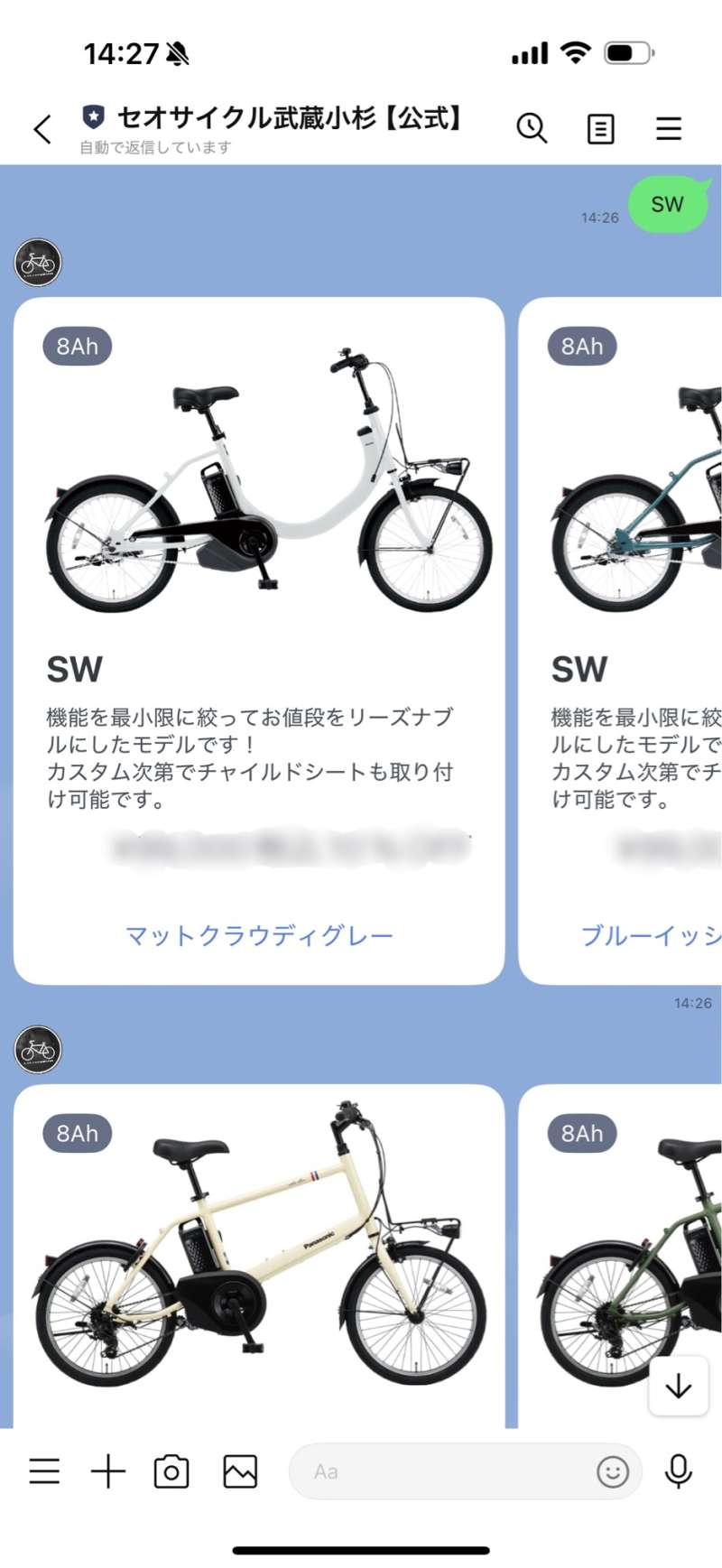 当店の公式LINEからワタクシ店長上野が『自分のカミさんや子供、親兄弟にこれなら安全に乗せられる!』とお勧めしているパナソニック車のスポーツタイプ電動自転車の販売価格、カラーを見られるように致しました!