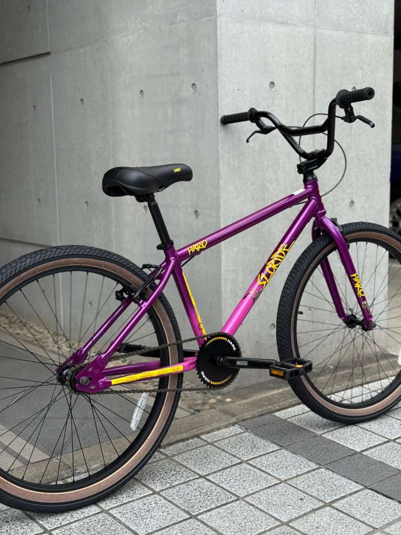 26インチのBMXクルーザーです。タイヤが太いので27インチの走行性を持っています!ペダルの漕ぎ出しは軽く、走り出すとすーーっと進んでゆくくフィーリングはBMXクルーザーならではでは。本当に街中をクルージングしやすいです!写真より実物はもっとカッコイイのでぜひ見にいらしてください!