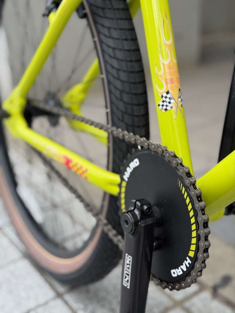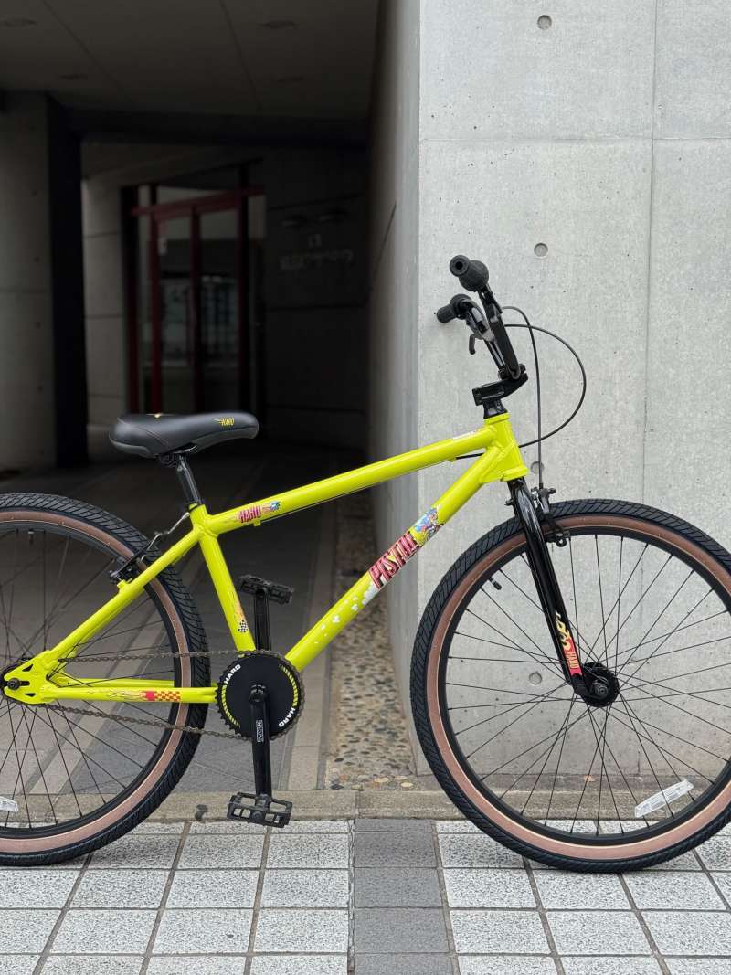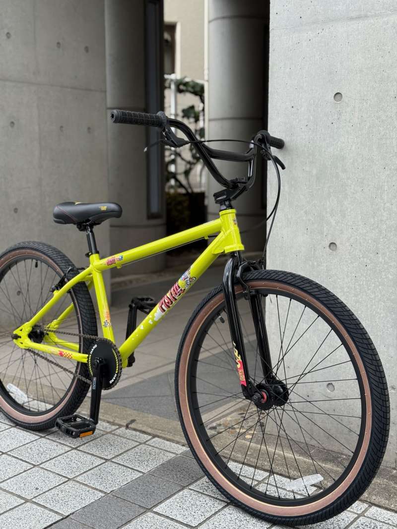 26インチのBMXクルーザーです。タイヤが太いので27インチの走行性を持っています!ペダルの漕ぎ出しは軽く、走り出すとすーーっと進んでゆくくフィーリングはBMXクルーザーならではでは。本当に街中をクルージングしやすいです!写真より実物はもっとカッコイイのでぜひ見にいらしてください!