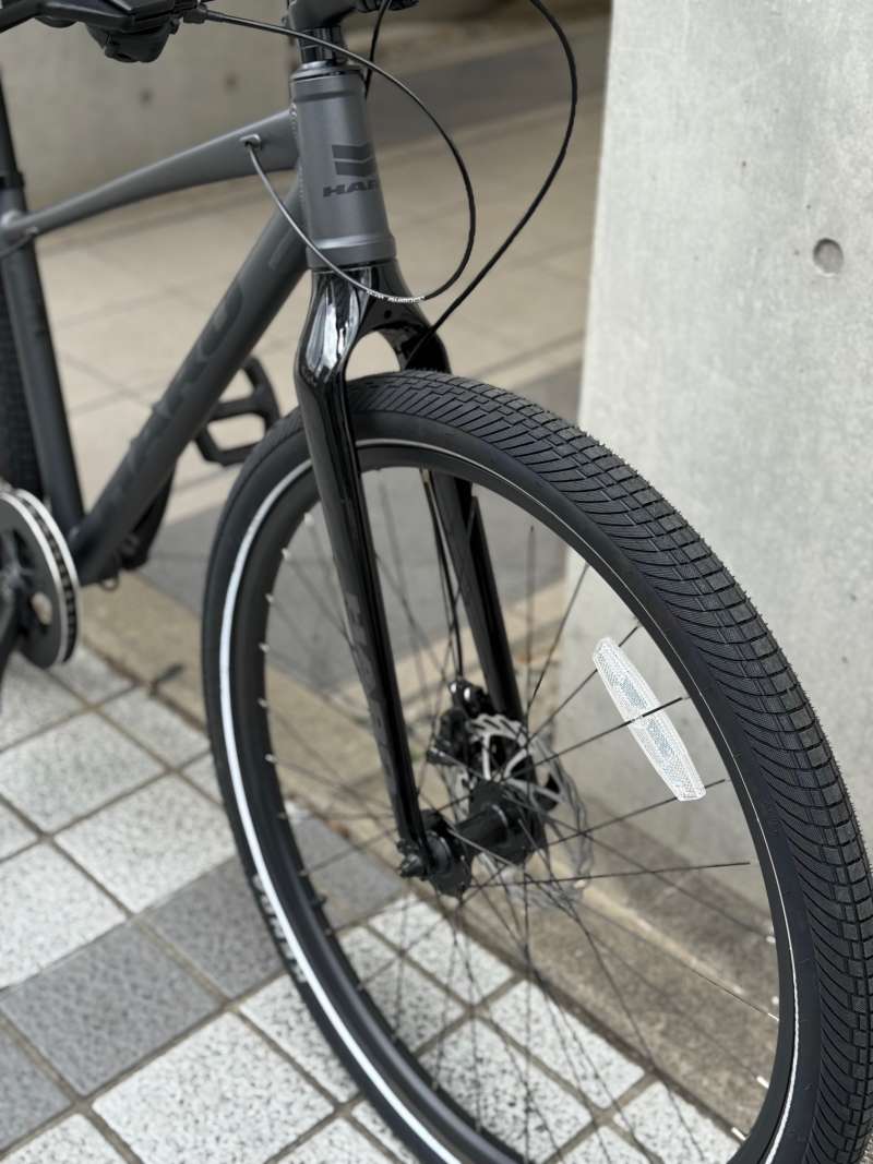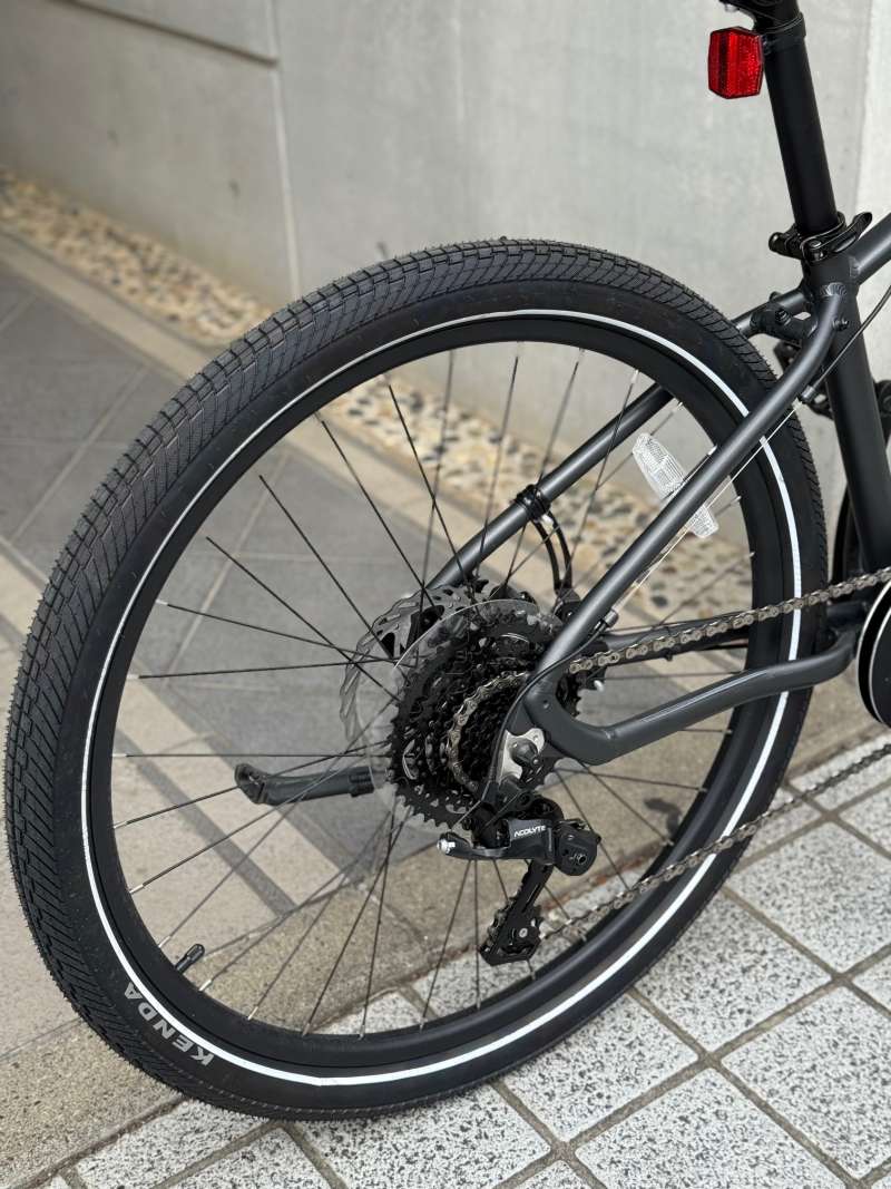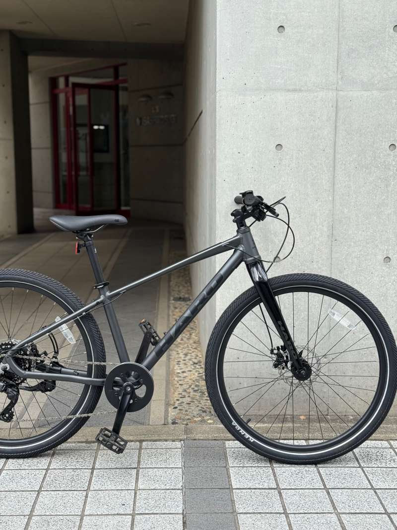27.5インチのMTB×クロスバイクです。タイヤが太いので700Cクラスの走行性を持っています!ペダルの漕ぎ出しは軽く、段差や溝も気にせず走れます。加速感や巡行のしやすさは乗ってからきっと驚かれると思いますよ!このモデルも街中をクルージングしやすいです!写真より実物はもっとカッコイイのでぜひ見にいらしてください!