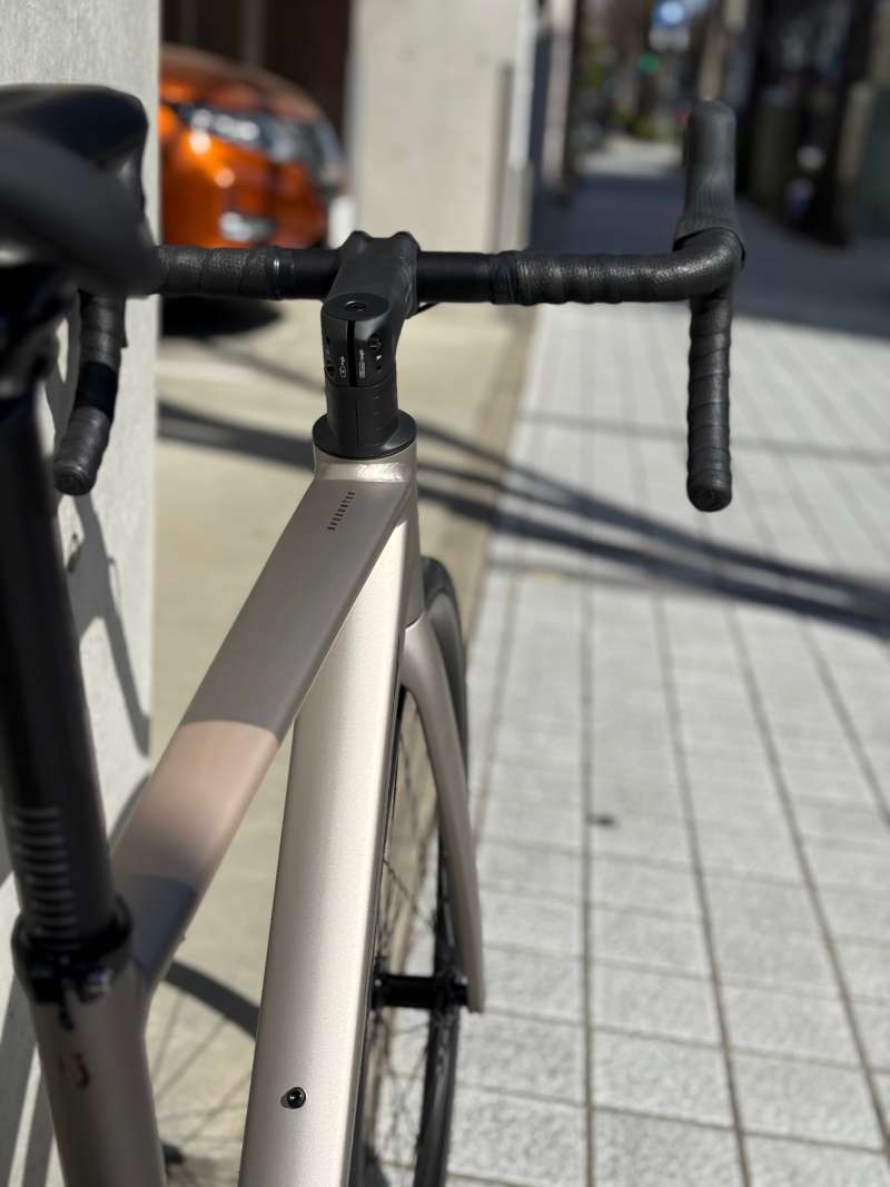 ヘッドチューブからフロントフォークへの美しさも見とれてしまいます。ラインナップ的にはエントリーグレードですが、いえいえこの高級感はエントリーモデルではございません!しなやかに膨らんだフロントフォークのおかげと思いますが乗り心地がとってもシルキーでございます。