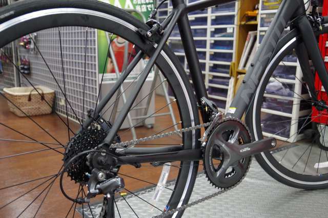 シマノ CLARISロードバイクコンポと、セミディープホイールにMAXXIS 28Cタイヤの組み合わせで、10kgを下回る重量を実現。