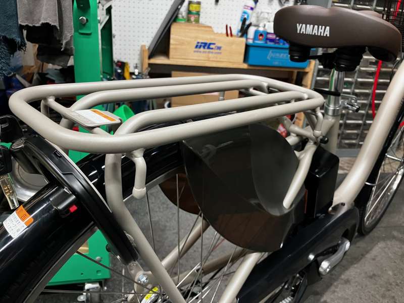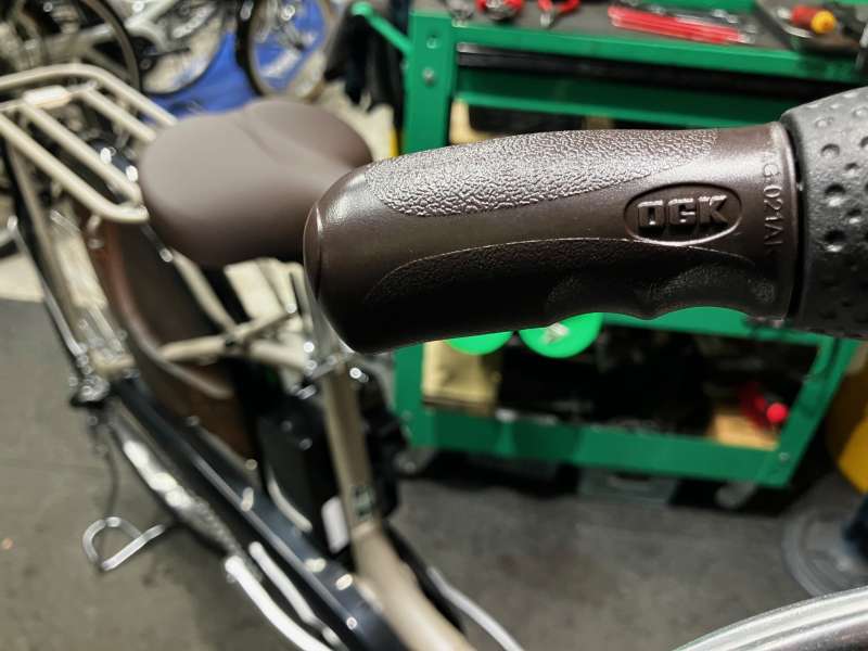 フレーム同色リアキャリア、コーディネートカラーなグリップとサドル。お洒落な人はコーディネート時に色遣いを3色まで抑えるらしいじゃないですか??うーむエレガント!