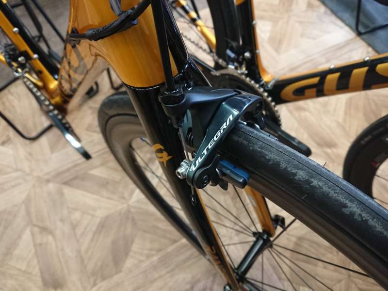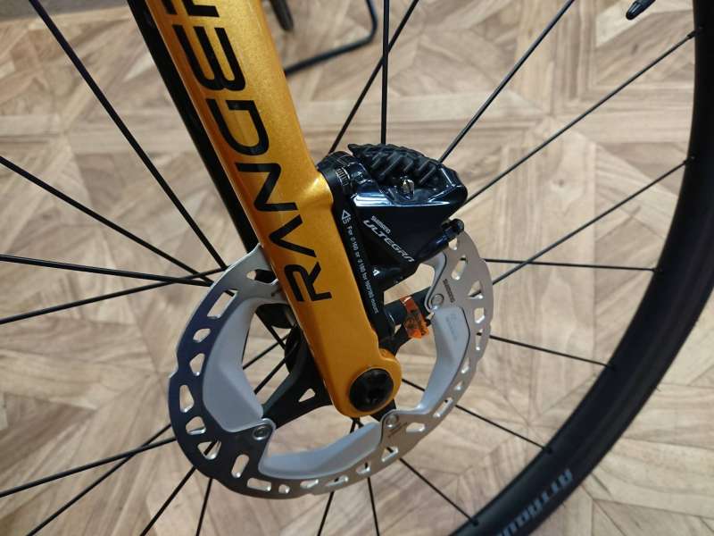 写真のモデルは「RANGER Team Limited」ゴールドカラーが映えるかっちょいいモデルです。リムブレーキモデルとディスクブレーキモデルでカラーが逆なのがカッコいいですね。もちろんどちらも左右でカラーが反転しています。