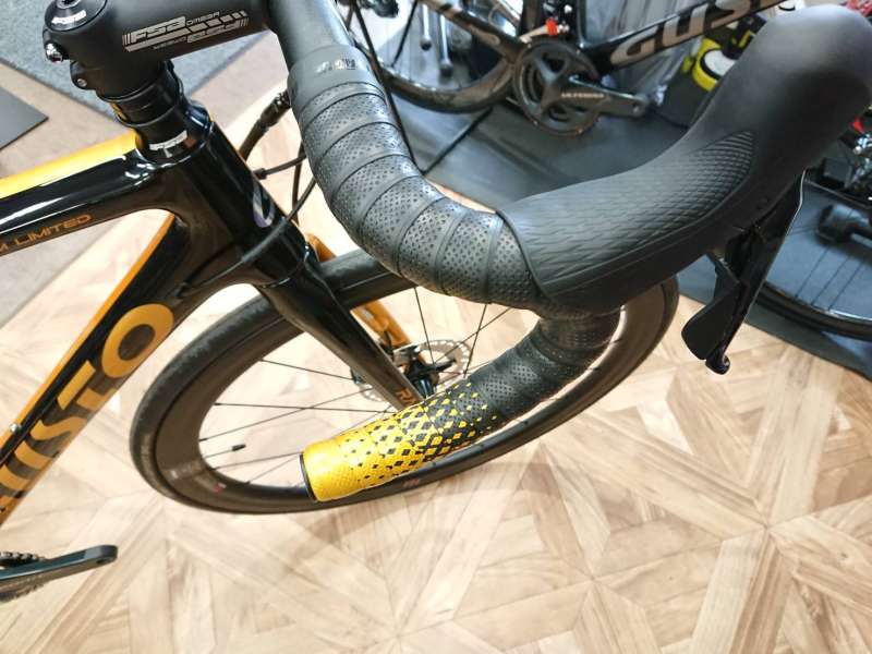 シートポストもオリジナルのカーボン製、見た目はごついのですが調整幅が広く扱いやすいモデルです。バイクの見た目と言えばかなり要素を締めるバーテープも最近流行りの途中でカラーが変わるタイプが採用されています。
