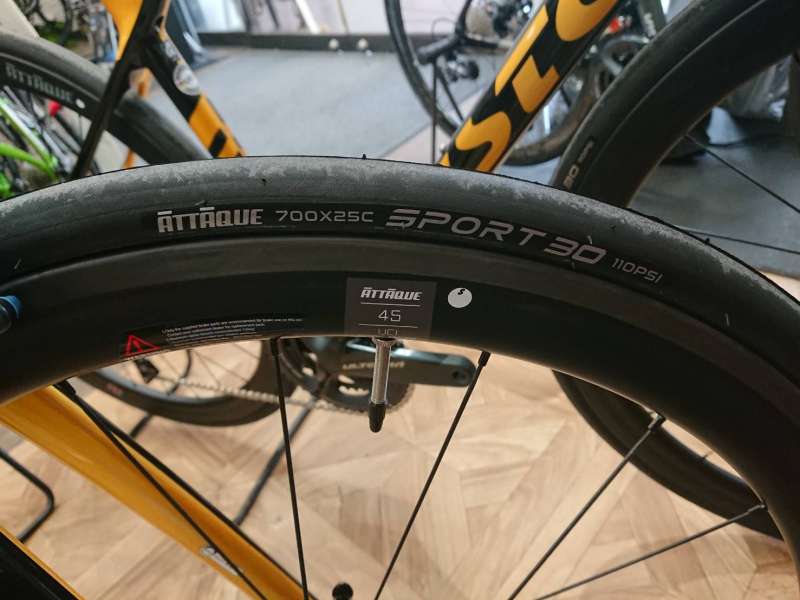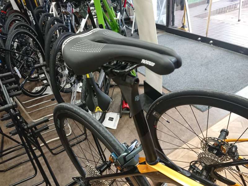 ホイールはリム、ディスク共に45mmハイトのオリジナルカーボンホイールが搭載されています。45mmハイトは平地でも登りでも使用できるベストなハイトですね。
