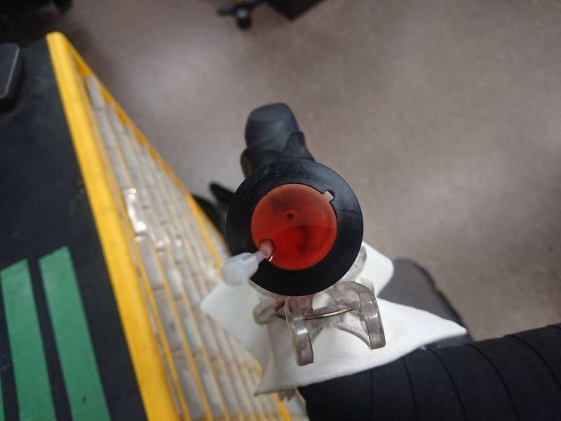 まず点検をしてから消耗パーツなどを確認し修理金額のお見積もりを出しました。作業内容と金額にご納得いただけたら作業開始です。まずはお客様ご希望のブレーキオイルの交換作業から行います。オイル自体の劣化は問題無さそうですがリアブレーキのみ若干黒い汚れが出てきました。キャリパー回りもかなりブレーキダストが酷かったのでそれが原因でしょうか?