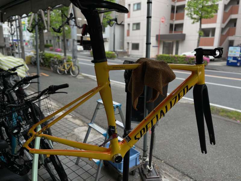 今回のフレームはかなり汚れがこびりついていたので、フレームにバラしてからコンパウンドで目立つ汚れを落としました。