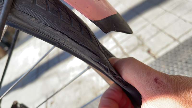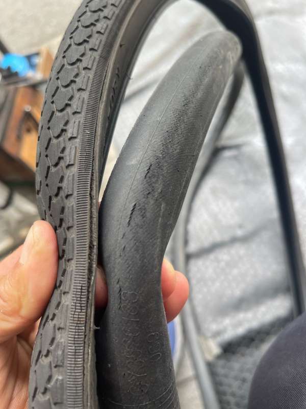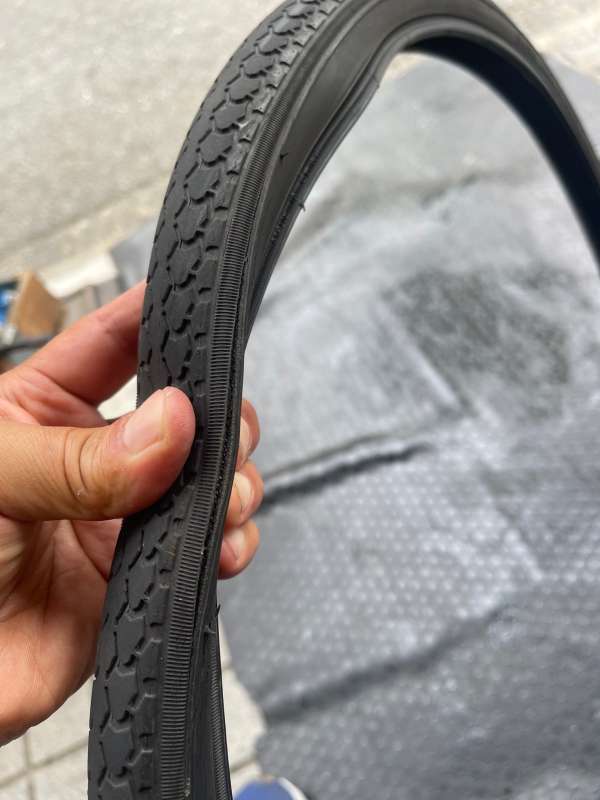 タイヤを潰してみると・・・・ひび割れが…中のケーシング(糸)が見えてしまっておりひび割れが深い事を意味しています。