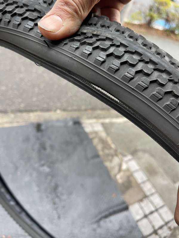 タイヤをよく調べると破れてしまっています。このケースも使用年数が原因でやぶれておりました。