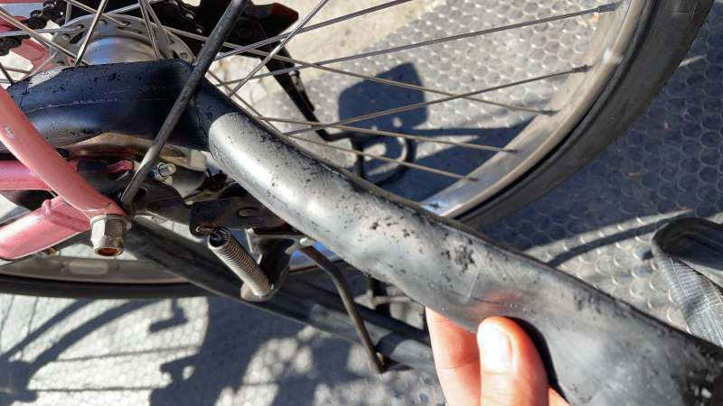 タイヤのサイドがひび割れてしまっています。こちらも同様にパンクしやすく、破裂のリスクがございます。ひび割れは主に乗車時の空気圧が適正でない事でタイヤがつぶれてしまう事が原因です。タイヤ自体の品質による場合もあり、低価格の自転車に装着されているタイヤはしなやかさや厚みがなく硬いため、ひび割れがでやすいようです。
