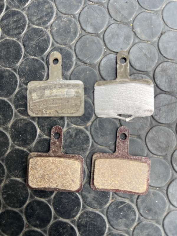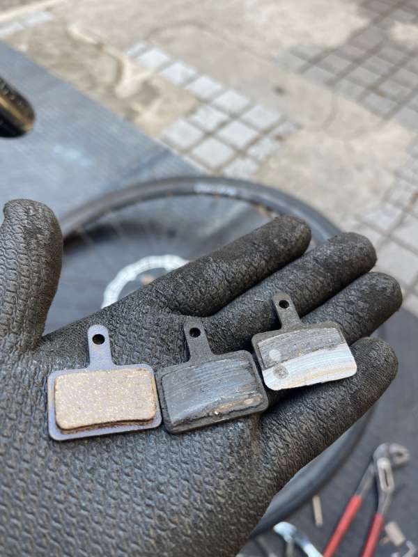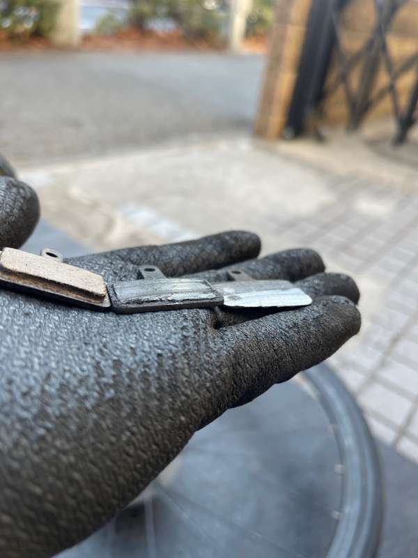 この3枚は左から【新品】【ギリギリセーフ】【完全アウト】のブレーキパッドです。