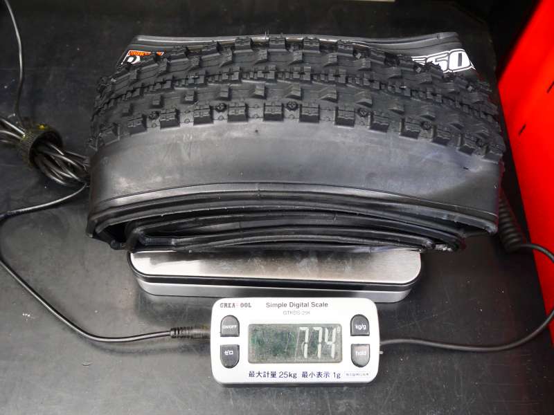 こちらがマキシス・クロスマークII。重量は実測で774gでした。センター部は比較的スムーズなノブ配置となっており、舗装路での転がりの軽さと、ブロックタイヤらしい見た目を両立しています。