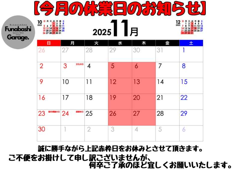 11月は定休日の水曜日に加えて、