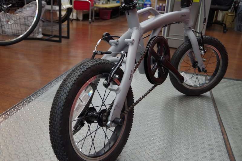 14×1.75サイズのタイヤはエアボリュームが高く見た目が小さい自転車とうらはらに、走行安定が高く乗り心地も良く快適。