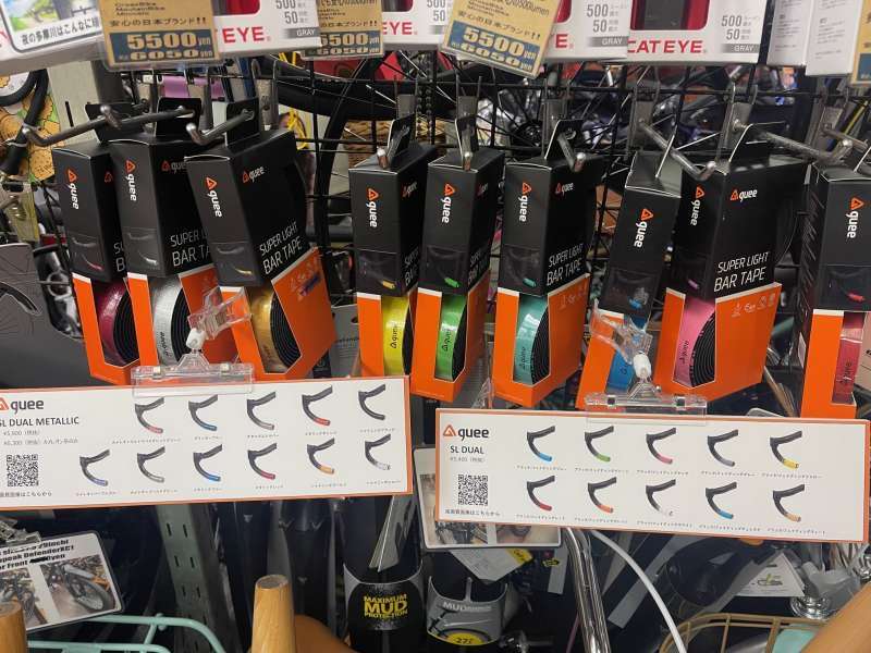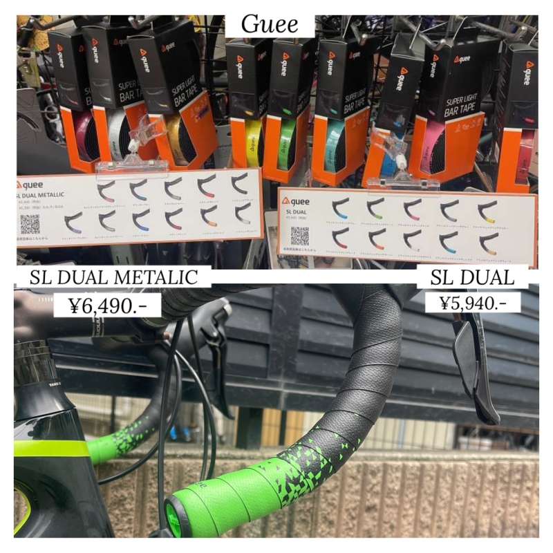 こちらはいかにも令和!といった最新デザインのブランドGueeです。高級ロードバイク生産のメッカ、台湾発の新興ブランドです。まだそれほど認知度はありませんが商品を見て店長のセンサーが反応したバーテープです。高価ですが、握り心地、質感、とにかくカッコイイ!!がおすすめポイントです。どんなロードバイクにも合わせやすいほどほどな尖り方のデザインと思います。
