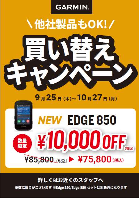 そんな「EDGE850」ガーミンさんが超お得な「GARMIN EDGE850 買い替えキャンペーン」を行います。気になるその内容は今お使いのサイクルコンピューターから「EDGE850」に買い替えること。もちろん他社製品からでもOKです。それだけでなんと本体価格が 1万円値引きされます!