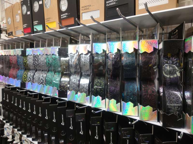 そこでせっかくアドバイスいただいたのでバーテープコーナーをリニューアルしました。今度の展示ではパッケージを斜めにすることでカラーを確認しやすいようになっています。バーテープの本数は変わっていませんが量感も増した感じがします。
